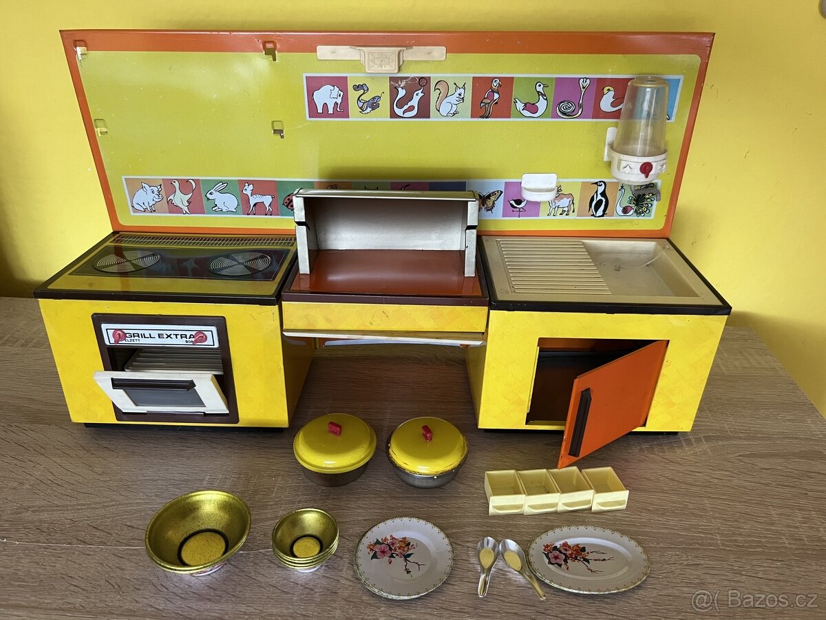 retro, klasika, detska kuchynka, holcicky, kuchynka s nadobim, 2 hrnce, 5 taliru, 2 lzicky, 6 misek, 4 supliky, trouba s grilem ma otevírací dvirka, plechová