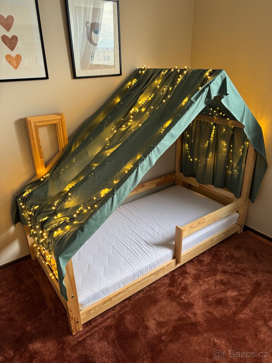Prodávám úplně novou domečkovou postel s komínem a zábranou. K dispozici včetně lamelového roštu (16 lamel), dokoupené zábrany k postýlce. Masivní konstrukce vyrobena z přírodní borovice. Postel nelepena!! Nosnost 90kg, rozměry postele: délka 173cm, šířka 89cm, výška 145cm.