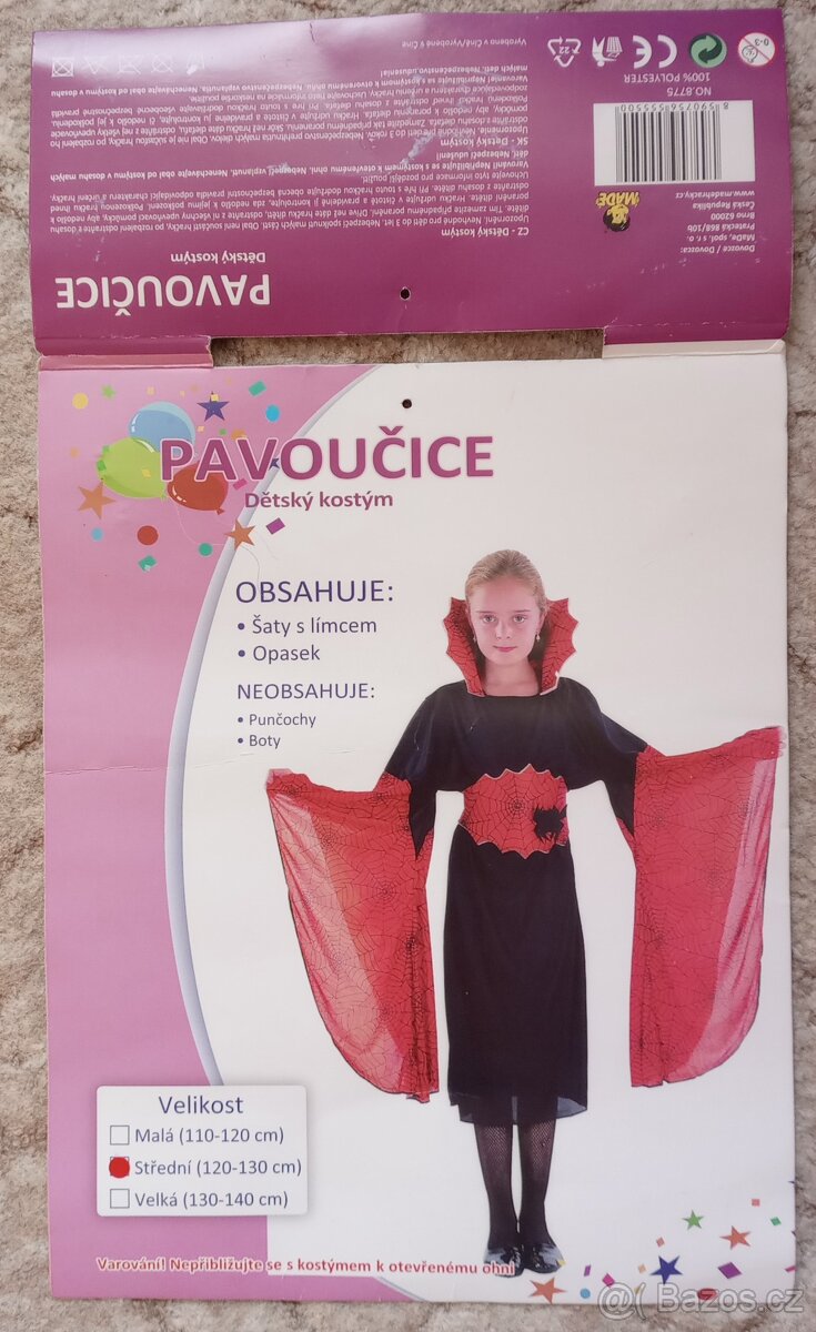 Prodám velmi slušivý dívčí karnevalový kostým Pavoučice, Střední velikost (120-130cm). Použitý asi 2x, stále ve velmi dobrém stavu. Opasek na suchý zip, lze regulovat délku. Bohužel délka rukávu neodpovídá obrázku. Délka šatů vpředu uprostřed 82cm, vzadu 84cm, šířka v průramcích 38cm, délka rukávu 34cm, šířka opasku 2x 27-30cm. Možný osobní odběr v Úžicích u Kralup nad Vltavou, Odolene Vodě, Praze a blízkém okolí, jinak pošlu poštou nebo přes Zásilkovnu či Balíkovnu.