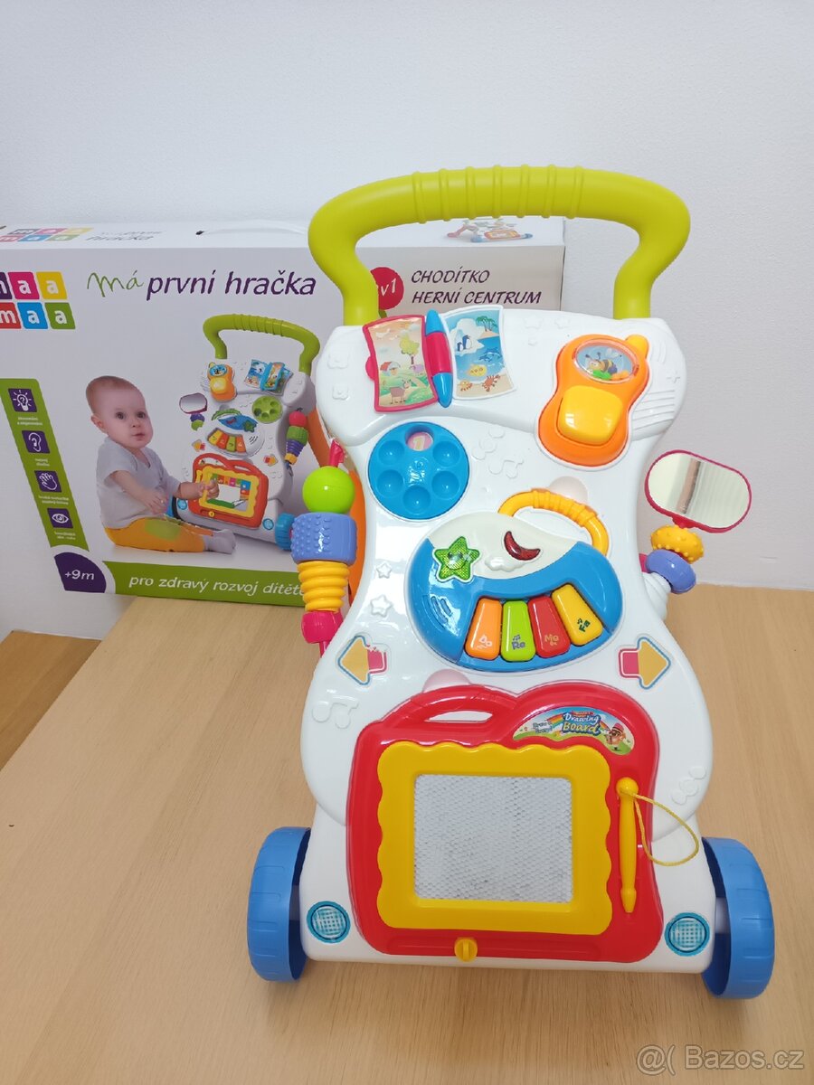 Na chodítku je umístěno hned několik rozvíjejících aktivit, naleznete zde například kreslící tabulku, telefon, plastovou knížečku, telefonní kolečko, hrací klávesy aj. Tyto věco lze bezpečně z chodítka vyjmout. Chodítko poskytuje dětem dostatečnou oporu během jejich prvních krůčků a podporuje manuální zručnost dítěte a správný vývoj hrubé a jemné motoriky.