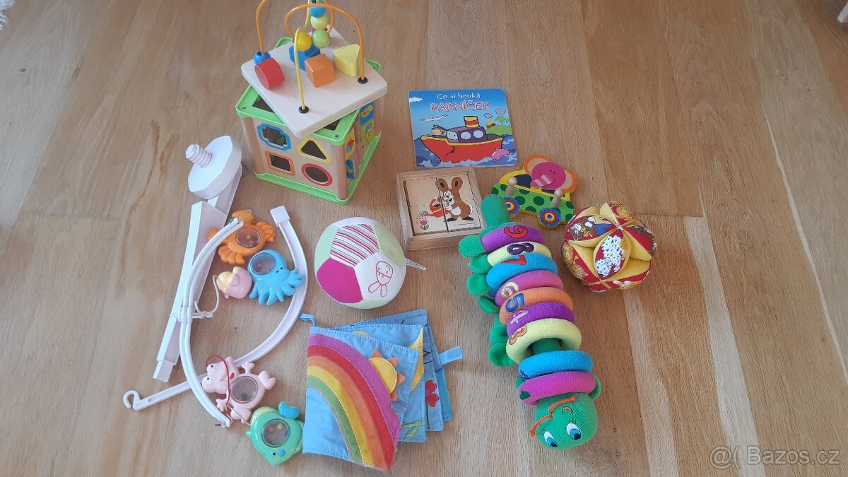 Prodám plyšovou housenku s čísly, 2 balonky pro trénování úchopu, látkovou knihu s interaktivními prvky, hrací kostku, knížečku a dřevěnou skládačku s krtkem.