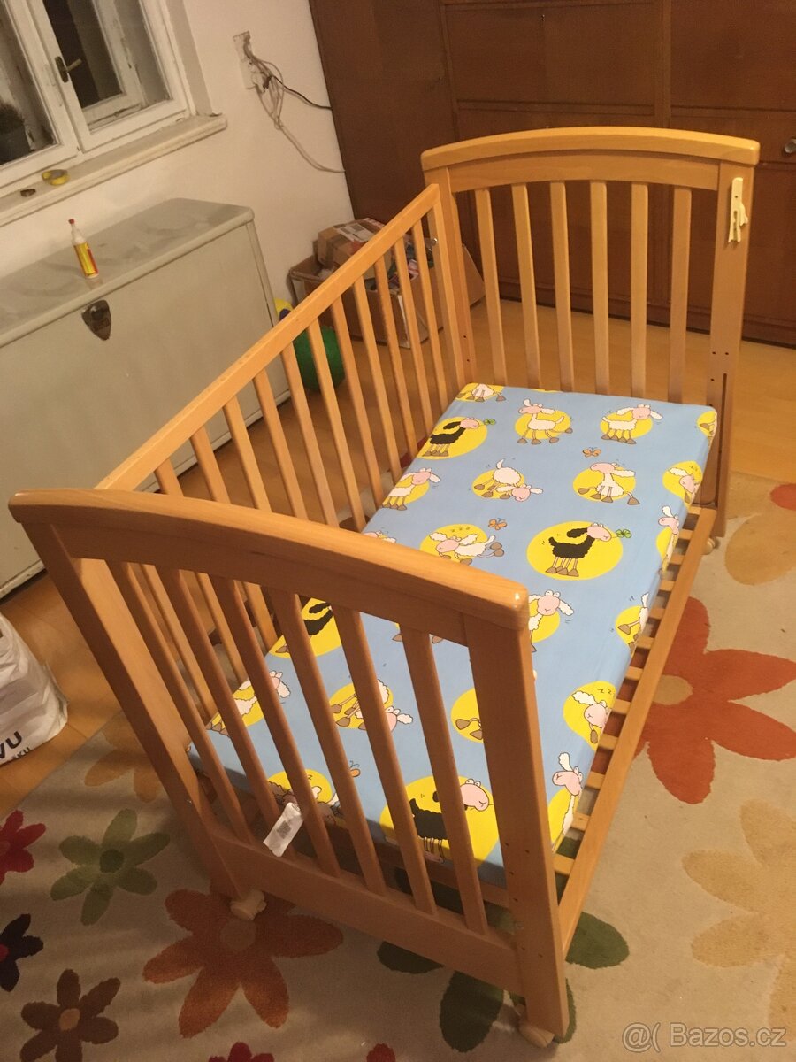 Dřevěná dětská postýlka - [10.2. 2026]Sundávací bok, praktická ochrana nahoře na bočnici, úložný prostor. Pište na e-mail