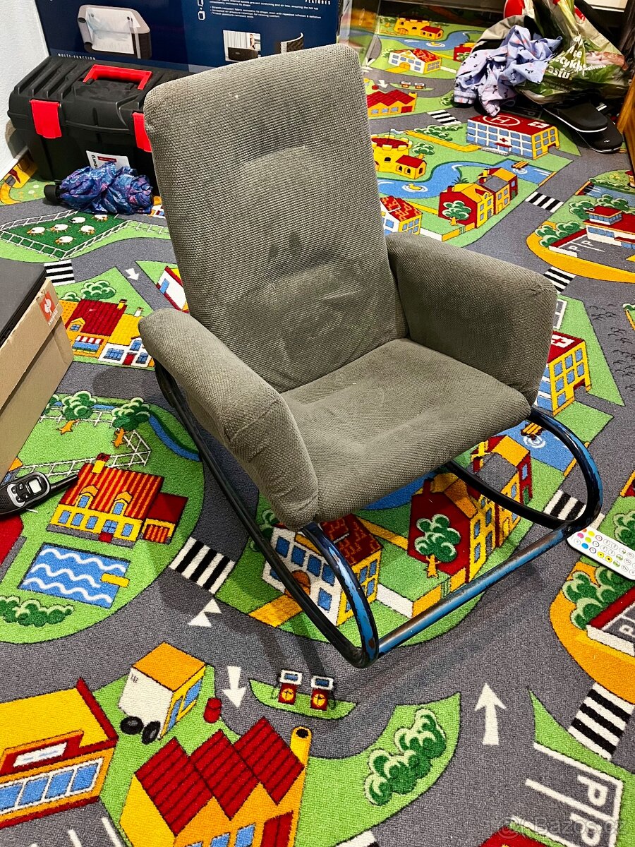 Prodám šedivé křesílko,je lehce opotřebované ale jinak bez chyby. Kompletně potažené látkou a houpací rám je tmavě modrý ze železa. Nosnost křesílka je více jak 70 kg