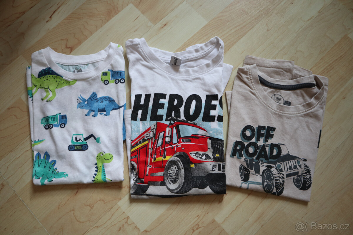 Prodám chlapecká trika: vel. 116 - hasiči a Off road, délka 45 cm, nošené málo, v pořádku, vel. 122 - s dinosaury, délka 47 cm, nové, jen vyprané. Cena za vše. Osobní odběr je možný v Rokycanech nebo v Plzni.