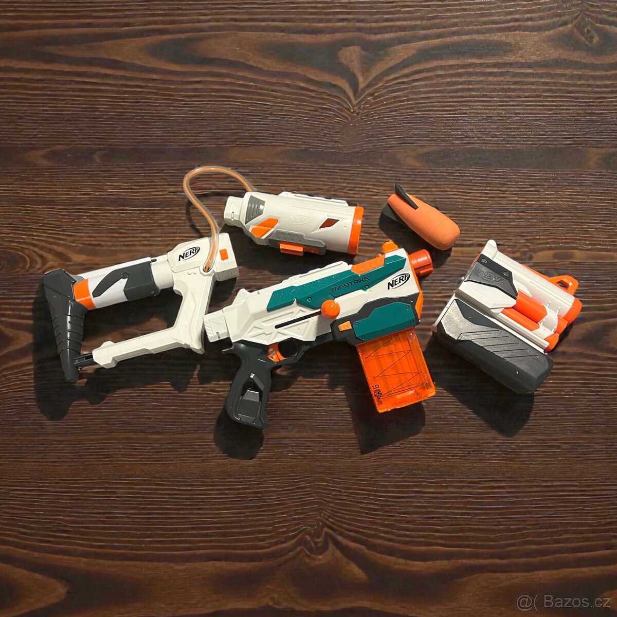 Prodávám Nerf blaster ve velmi dobrém stavu, plně funkční. Součástí je více modulárních doplňků, takže si zbraň můžeš sestavit přesně podle sebe – ideální na Nerf bitvy, hraní venku i doma.