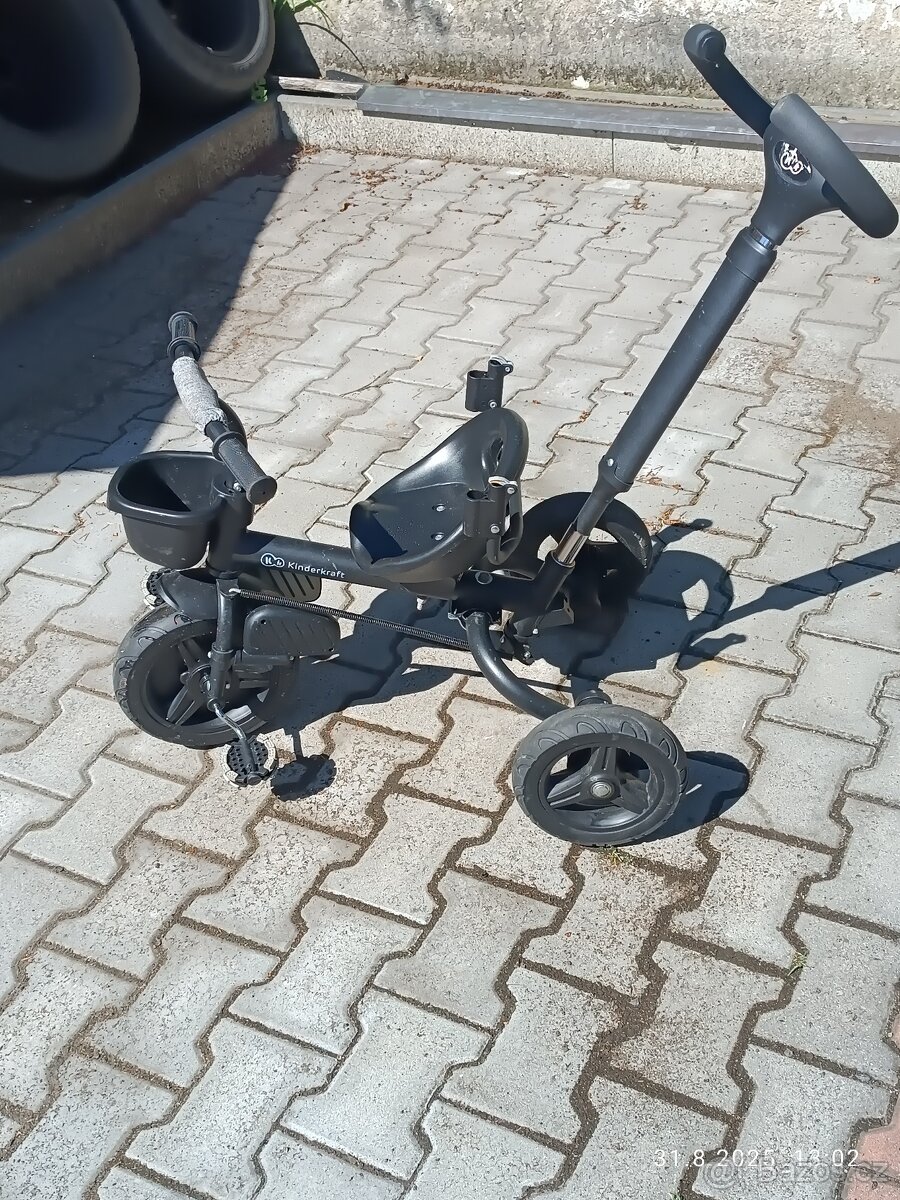 dětská tříkolka kinderkraft, s odnímatelnou řídicí a vodící tyčí, pomocí které tlačíte dítě a současně zatáčíte do stran, V předním kole je aretace, která funguje tak, že dítě buď šlape samo nebo vypnutím aretace se přestanou točit šlapky, dítě si dá nohy na stupačky a Vy jej pohodlně tlačíte. Trojkolka má vzadu dvě mechanické brzdy, aby tříkolka neodjela, Jde o požitou věc, na řídítkách je košíček na hračky, bohužel již není stříška, v případě zájmu mohu tříkolku dovézt k Vám.