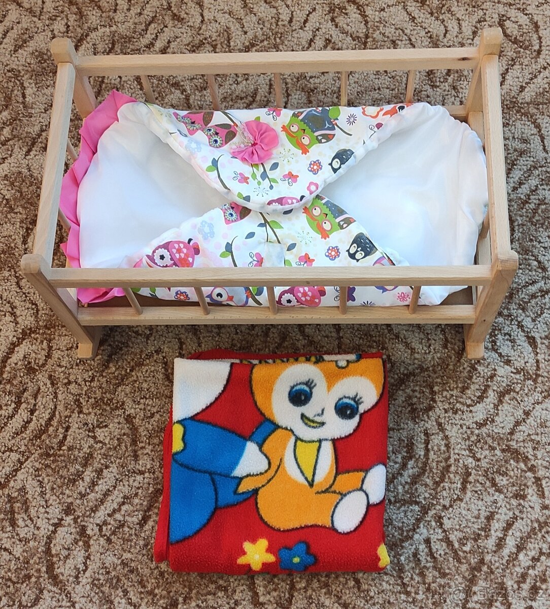 Prodám dřevěnou kolébku/postýlku pro panenky + zavinovačka + deka (cca100x100cm). Cena 200,-kč za celý komplet.