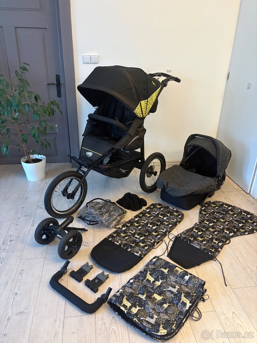 Díky velkým 16 palcovým kolům, přednímu pevnému kolu a ruční brzdě je skvělý do jakéhokoli terénu - louka, pole, les, kopce a s přehledem zvládne i sníh. Všechna kola jsou v perfektním stavu, nejsou ani trochu sjetá. Kočárek je vhodný na běh a na kolečkové brusle. Do města můžete dát místo pevného kola otočné dvojkolo, které lze v případě potřeby zaaretovat.
