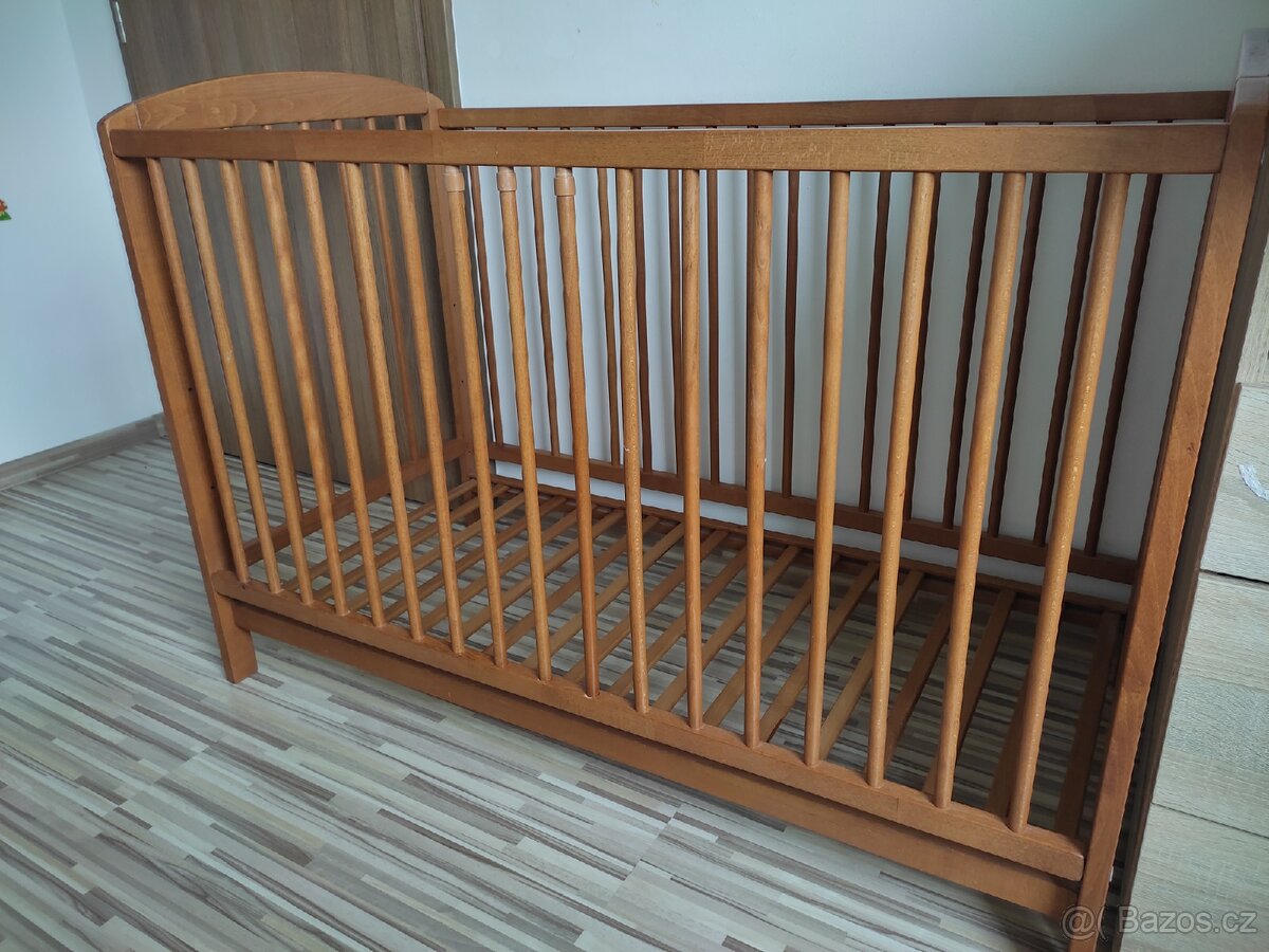 Prodám dětskou postýlku po 2 dětech, kupovaná nová. Má 3 vytahovací šprušle a 3 výškové polohy ( + čtvrtá navíc navrtaná)