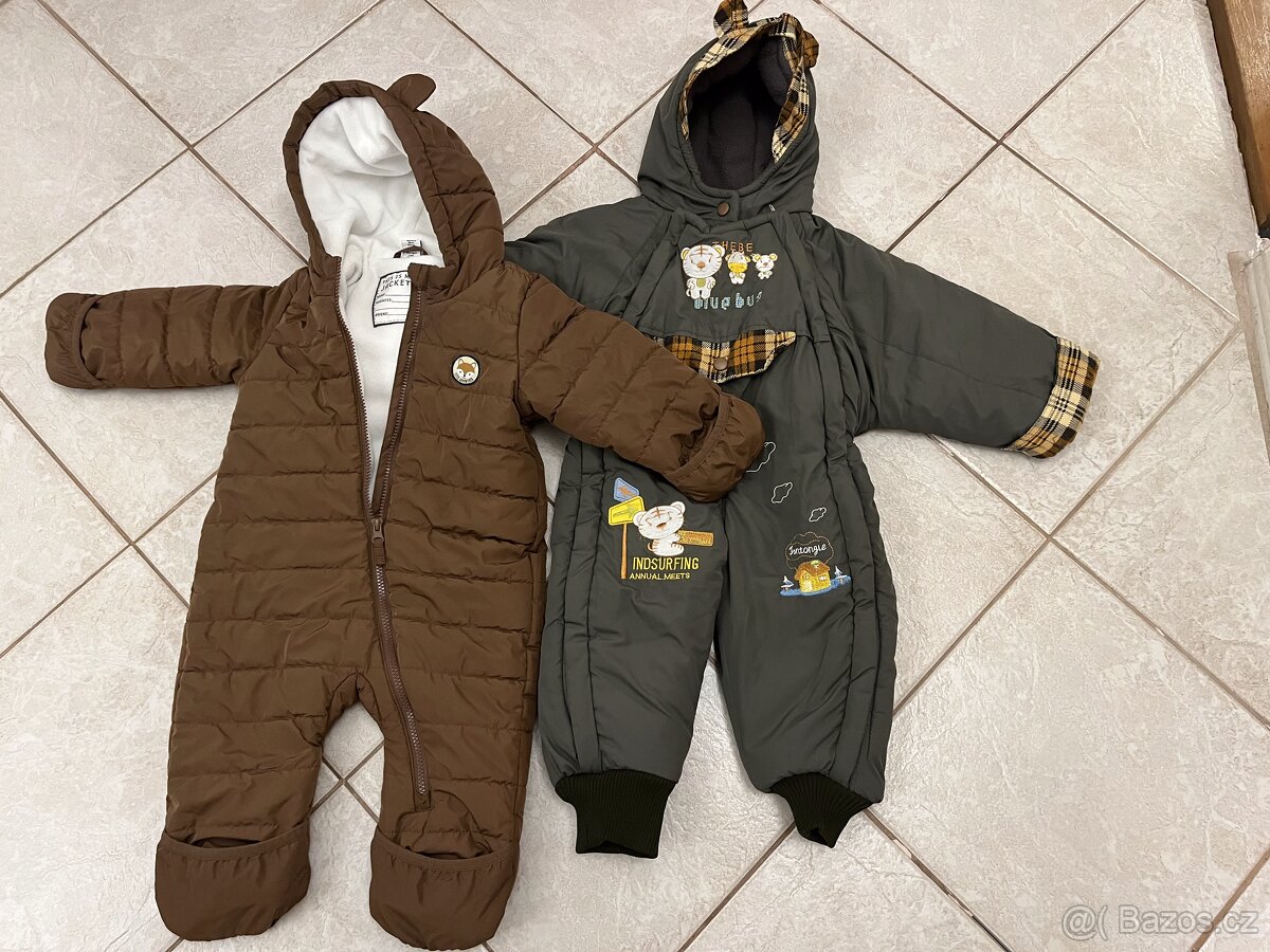 Prodám dvě zimní kombinézy - vel. 74, barva hnědá, s překrytím rukou a nohou (přehyb); vel. 98/104, barva šedozelená, nenošená. Samostatně za 300 Kč/kus. Pouze osobní odběr, Brno-Komín.