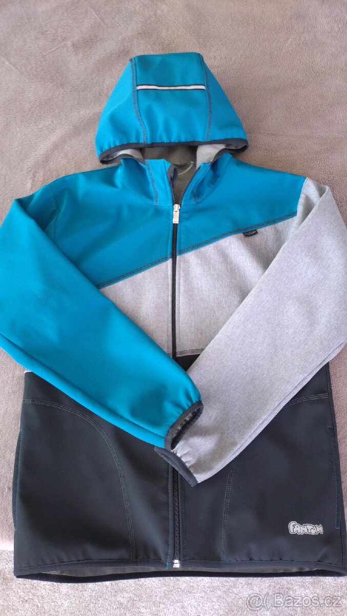 Dětská softshellová bunda Fantom vel.134 - [7.2. 2026]Maskáčová-černá, šedá, svítivě žlutá. Reflexní prvky, dvě kapsy na zip, uvnitř fleece,poutko, návleky na ruce, kapuce. Nošená,ale ještě plně funkční,bez vady, reflexní prvky pěkně světelné.