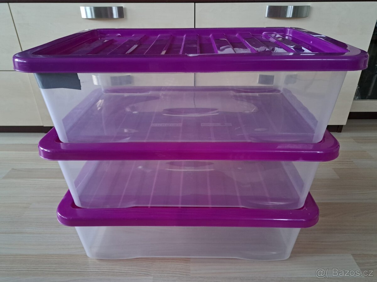 Prodám set (3ks) plastových úložných boxů s víkem HEIDRUN Quasar 30l. Výborné jako úložné boxy pod dětskou postýlku. Vejdou se vedle sebe pod postýlku 120x60cm. Rozměry 18 × 60 × 40 cm (V׊×H). Jeden z boxů je trochu prasklý, ale nemá vliv na funkci. Osobní odběr Praha 11