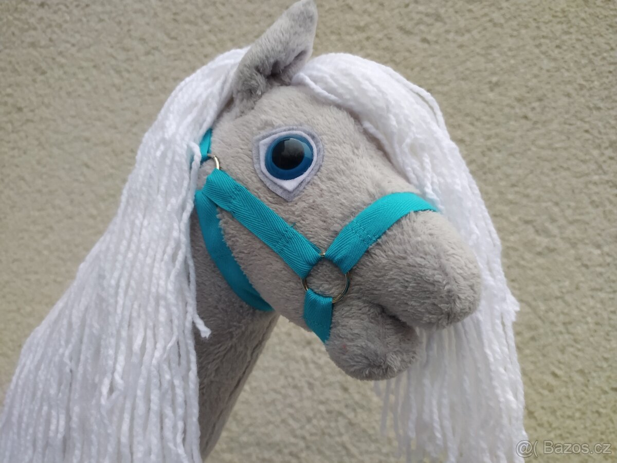Prodám nového hobby horse šedé barvy s dlouhou bílou hřívou a modrýma očima. Tyrkysová ohlávka a tyč jsou v ceně, tyč je napevno vsazená do hlavy. Celková délka je 69 cm, váha 470 g.