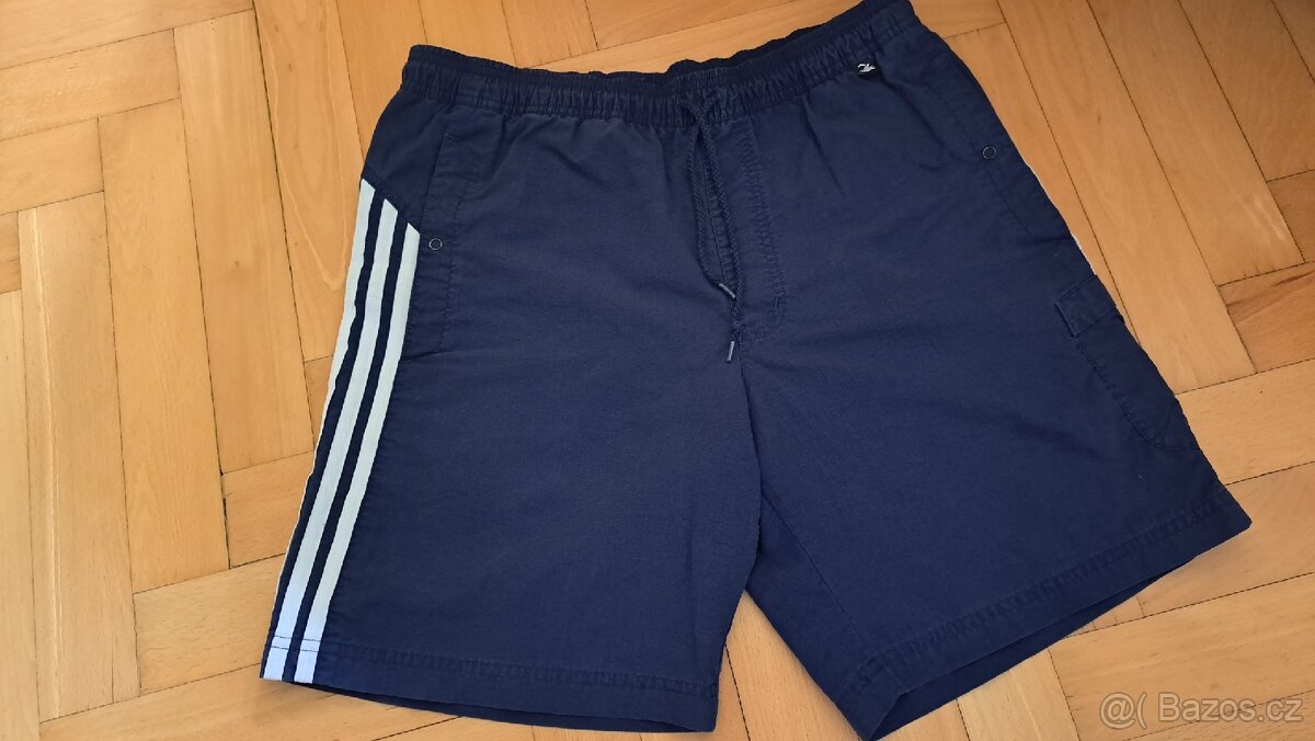 Adidas modré koupací kraťasy,vel.S,zajímavé,rychleschnoucí materiál,vpředu 2 kapsy na cvoček+2 na suchý zip,nošené,ale velmi dobrý stav