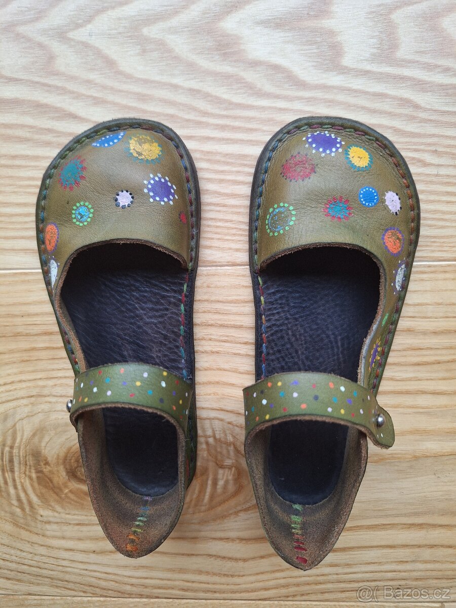 Originální ručně šité kožené barefoot baleríny. Nošené. Místy již odřené malování (viz foto). Jinak zcela v pořádku. Vnitřní délka 18cm, šířka cca 6,5cm.