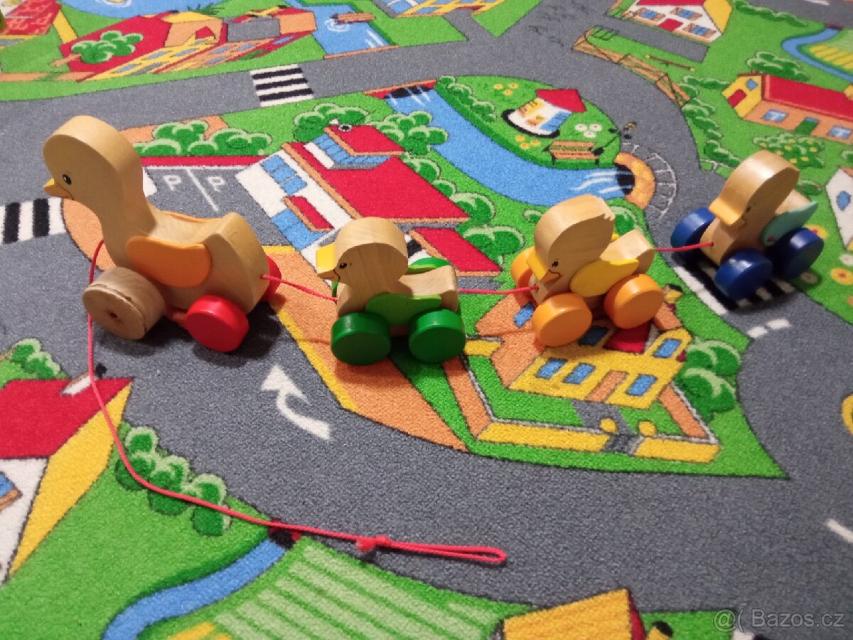 Dřevěné tahací kačenky, křidélka poslední kačenky se za jízdy pohybují, Rozměry : 55 x 7,3 x 16 cm . Při výběru více předmětů z mojí nabídky platíte poštovné pouze jednou.