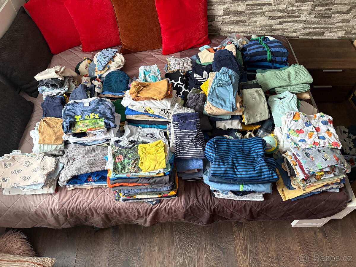 Oblečení pro chlapečka- trika a body(krátký i dlouhý rukáv), mikiny, tepláky, teplákovky, džíny, pyžama, overaly, kraťasy, tílka, capáčky, čepice, kšiltovky, klouboučky, ponožky, bundy,vesty- různé značky: C&A, Lindex, Reserved, KIK, Pepco, Lidl aj. Nekuřácká domácnost, vše čisté a vyprané.Pouze osobní předání Rožďalovice, po dohodě mohu dovést do Nbk, Ml. Boleslavi, Jičín