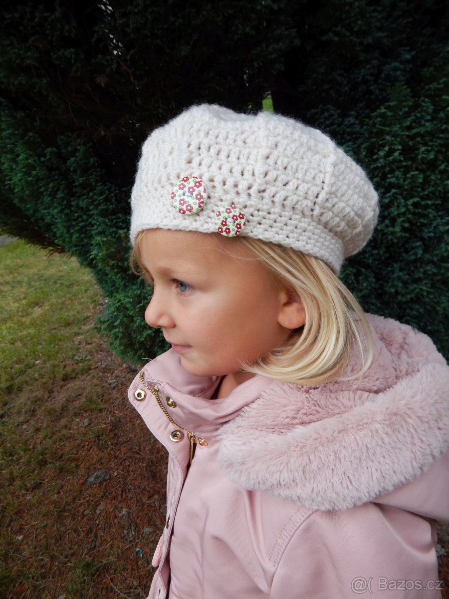 Háčkovaná čepice pro holčičku - podzimní, zimní - se slušivými knoflíčky s kytičkama.