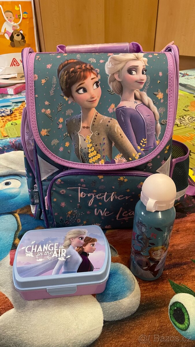 Prodám úplně novou aktovku s motivem ledové království. Jako bonus k aktovce přidám úplně novou láhev na pití a krabičku na svačinu.