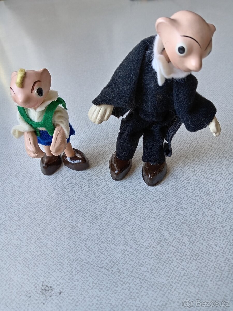 Staré figurky Spejbla a Hurvínka. Hurvínek má vzadu uvolněné kšandičky.