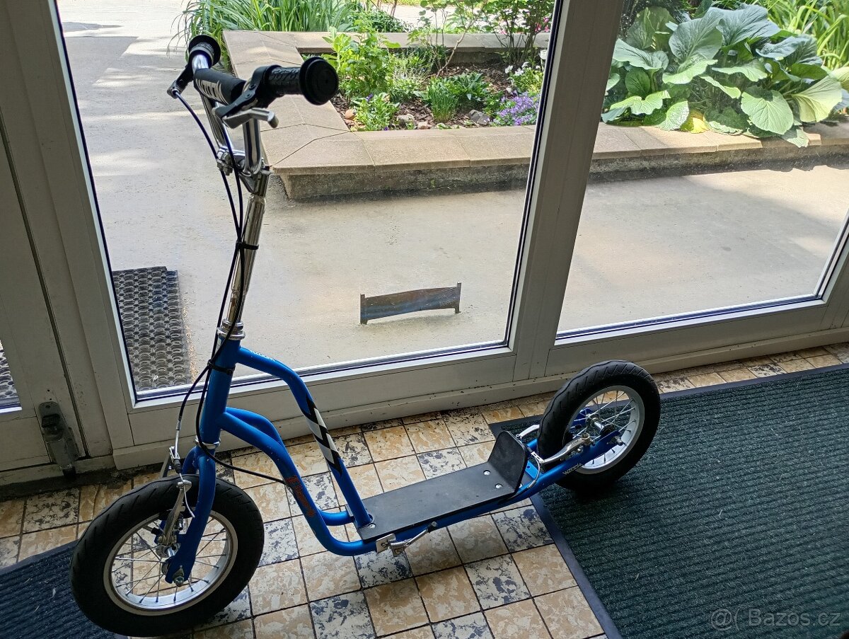 Vhodná pro děti cca 4-7 let.. Zadní kolečko má brzdu. Výškově nastavitelná.