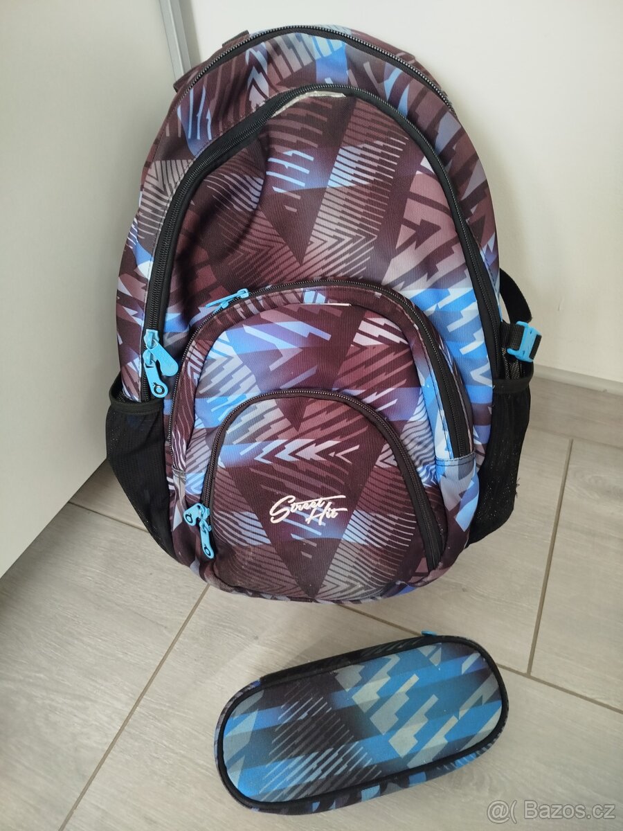 Vhodný od 5.-6.tridy,pěkny,všechny zipy plné funkční,jedinou slabostí jsou síťky na pití,takže je zášitá.Čistý-vypraný.