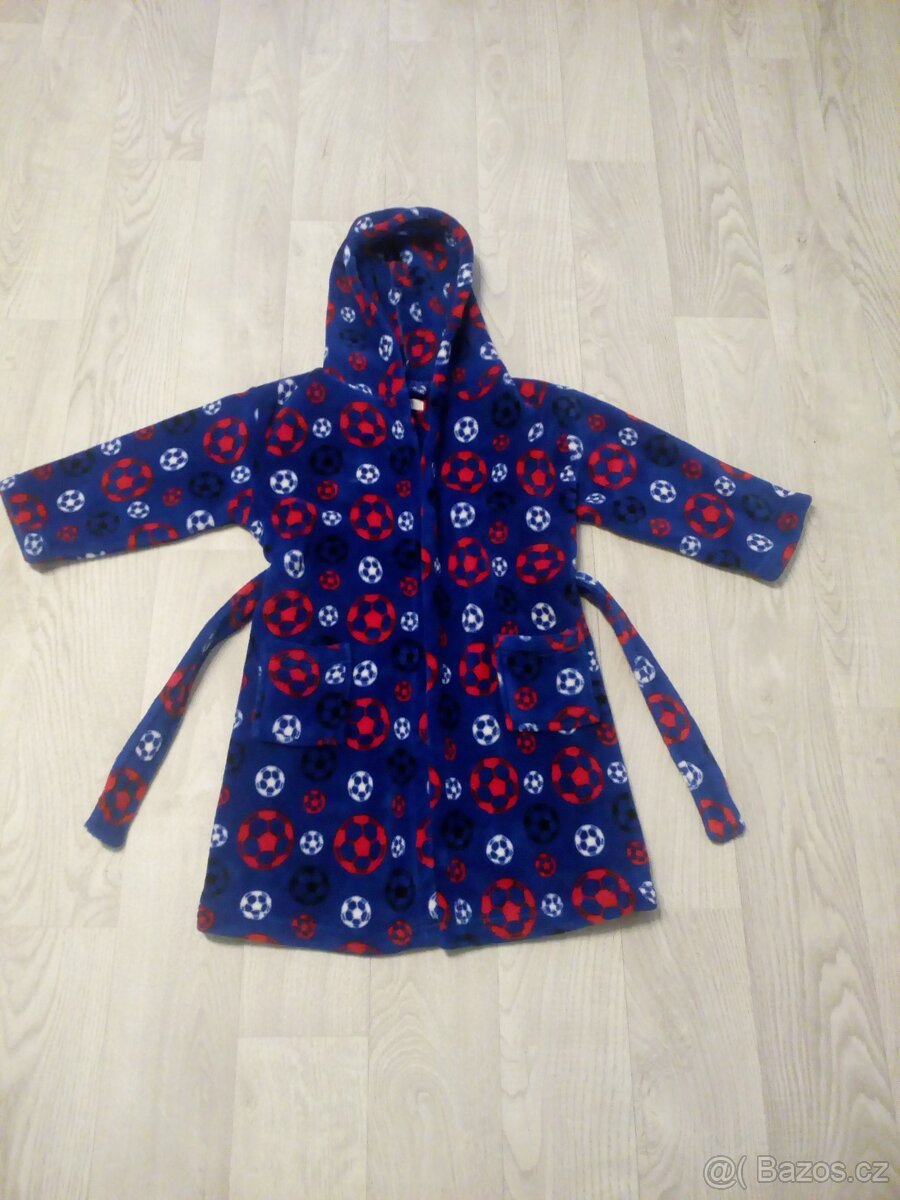Prodám dětský teplý župánek s kapucí.Velikost 3-4let s motivem fotbalových míčů.Skoro nepoužívaný.