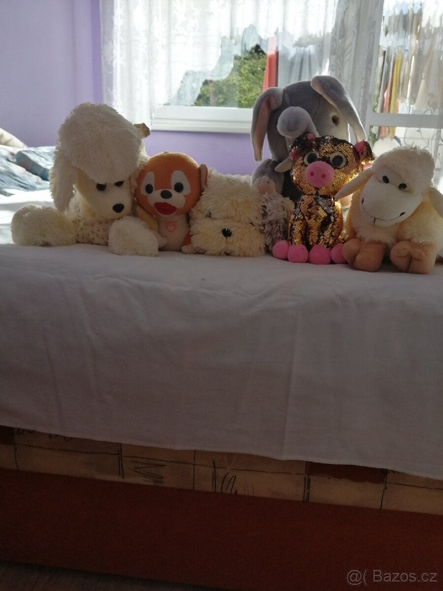Prodám 6 plyšových hraček-2pejsci,1 ovečka, 1slon a opička mluvící a prasátko s flitry a dají se otáčet. Jen vážní zájemci, nejlépe osobní odběr. Po domluvě zašlu přes zasilkovnu nebo balikovnu, nejlépe sms, email.