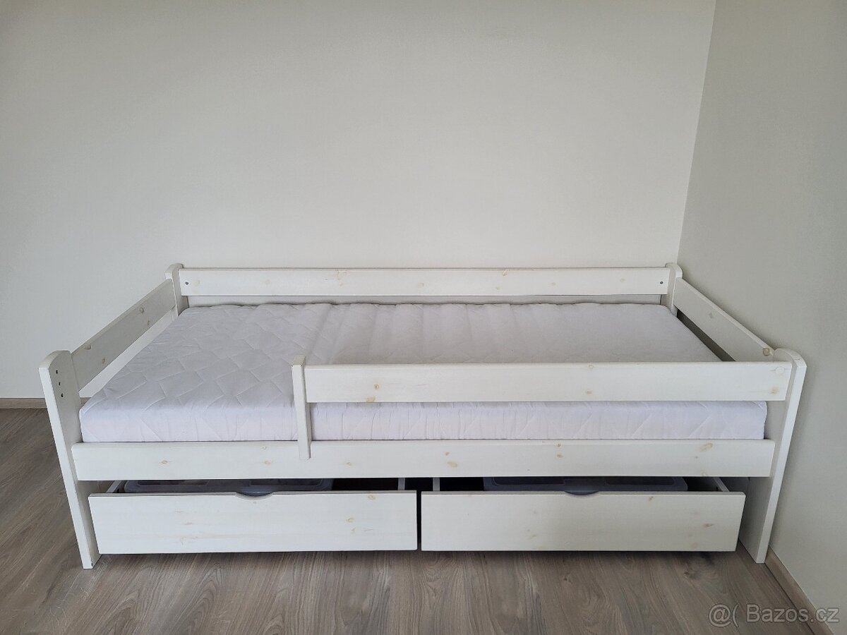 Prodám dětské postele s výsuvnými šuplíky vč. kvalitních matrací. Rozměr matrace 180x80x13 cm, perfektní stav, tvrdost H2/H3. Rozměr rámu postele délka 187, výška 60, šířka 90 cm. K dispozici 2 ks. Cena za jednu 1 490 Kč.