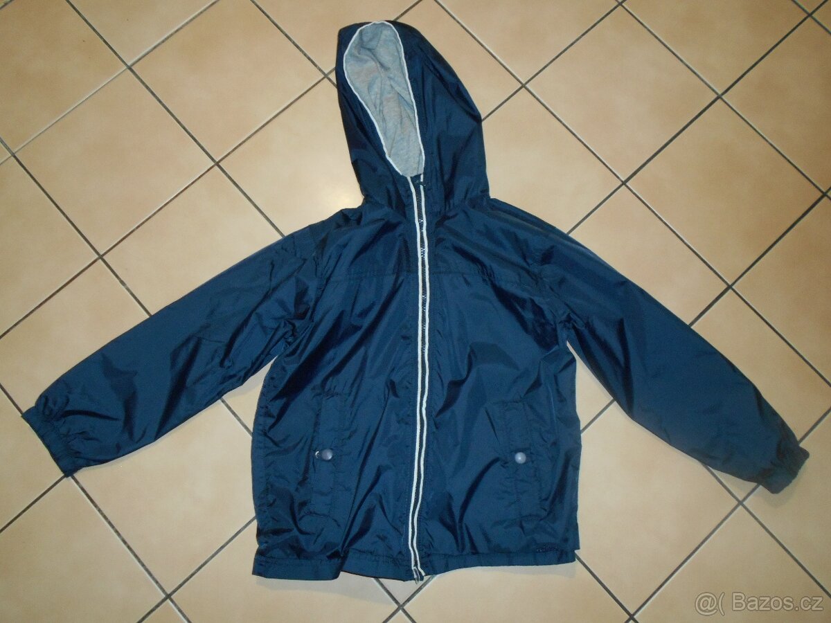 Nabízím pro kluka modrou šusťákovou přechodovou bundu na jaro/podzim na vel.128, zn.T.Quality fashion. Zapínání vepředu na zip, dole kapsy zapínací na druky, bundička vepředu i vzadu a v kapuci vypodšitá bavlnou a v rukávech šusťákem, délka za od krku dolů 53cm, délka rukávu od ramene 44cm, šíře přes hrudník 2x46cm. Bundička je v pěkném stavu.