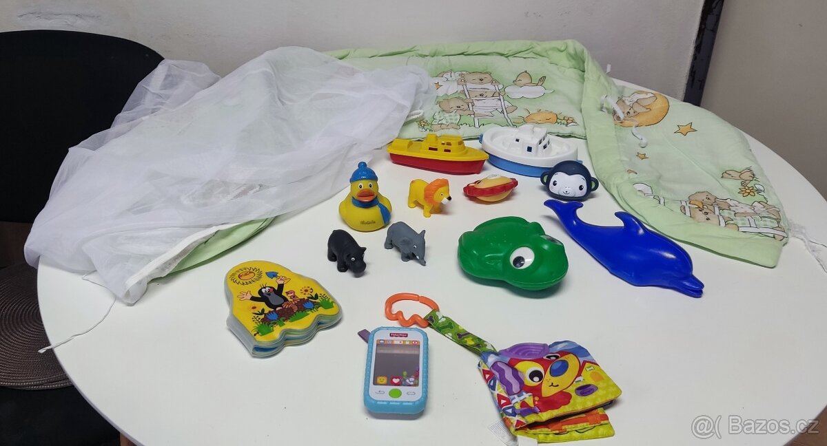 Prodám téměř novou moskytiéru na kočárek, nevyužila jsem. Prodám vše včetně hraček pro miminko. Gumové hračky do vody, mantinel do postýlky, klip na kočárek a telefon Fischer Price.