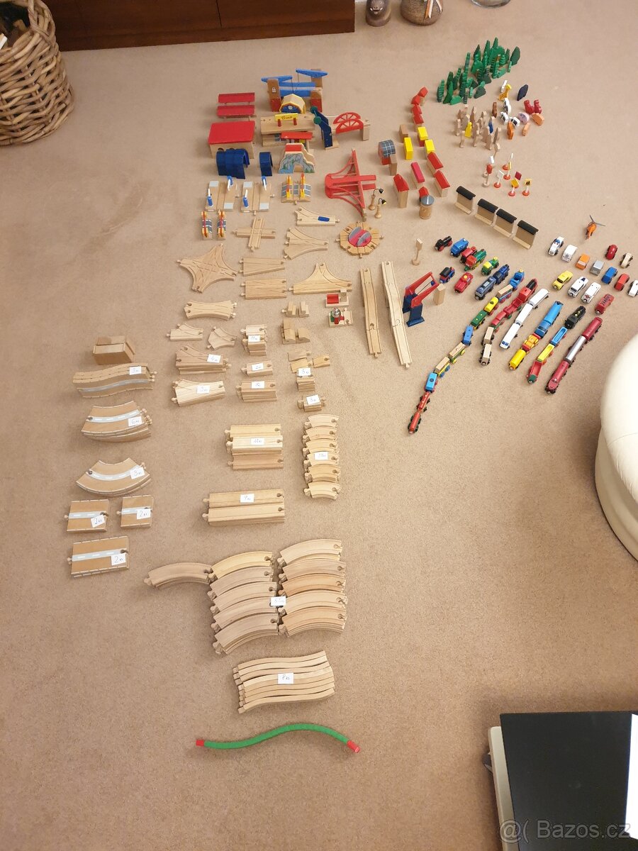 Nabízím k prodeji velkou sadu kolejí a vláčků BRIO + mnoho dalších doplňků, viz. foto. Parkovací dům je se zvedacím výtahem a je k němu i sada dřevěných silnic s mostem, přejezdem atd.