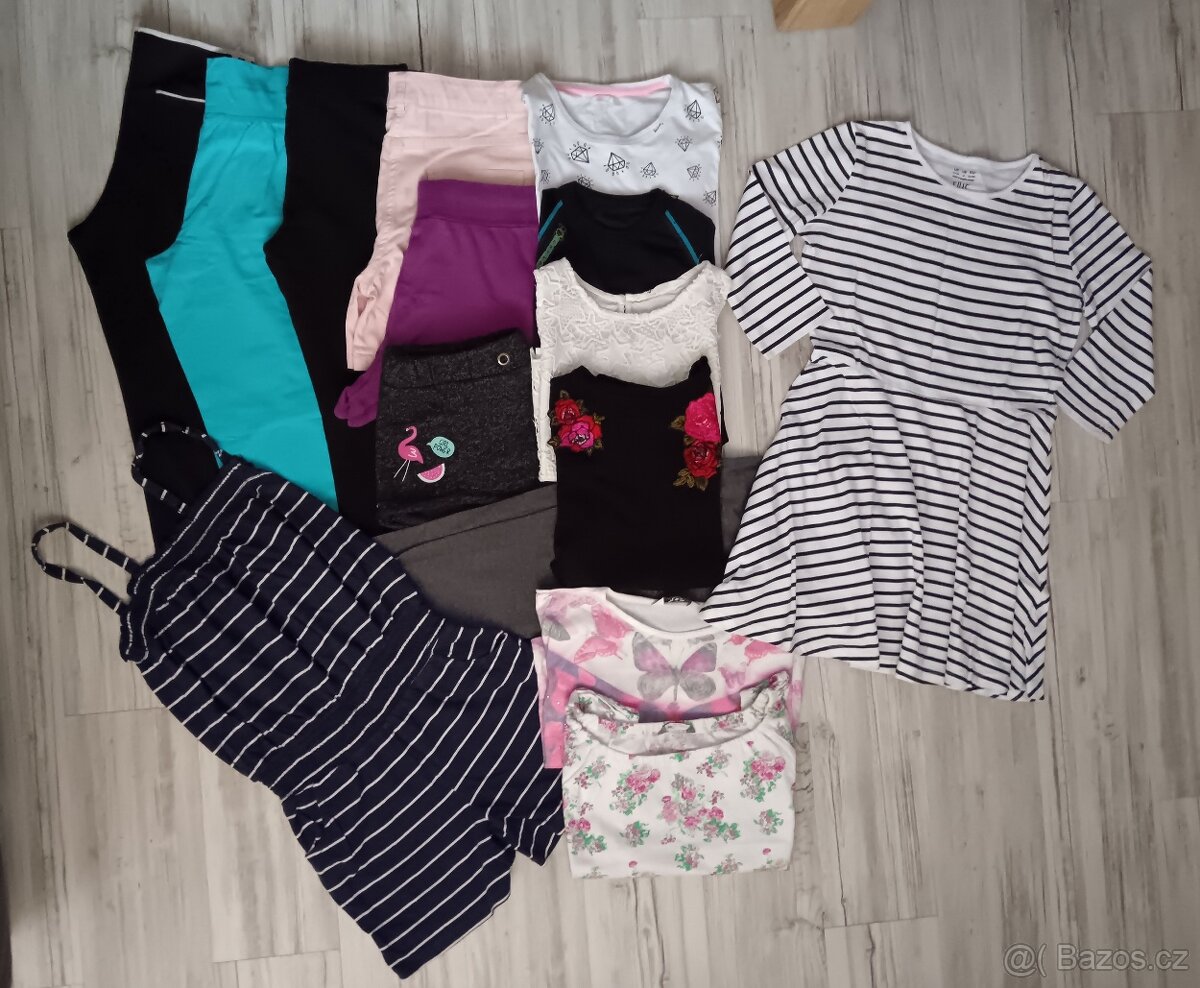 Pěkné oblečení po dceři vel 146-164 (trička, kraťasy, legíny, šaty, overal letní, svetr)