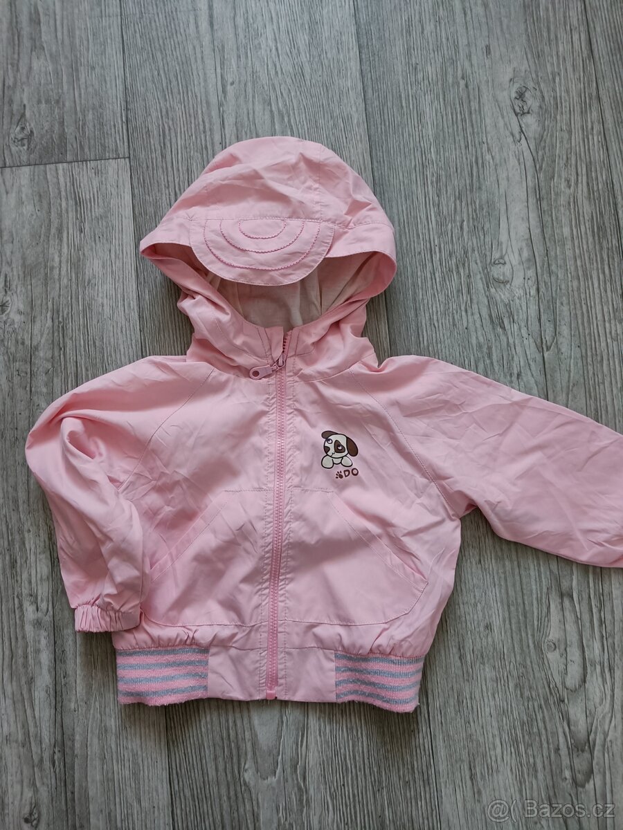Nošená, ale stále v super stavu. Značka Frog. Velikost uvedená 62/68. Jemný šusťák, podšitá. Na kapuci má kšiltík. Polyester. Šířka 26,5 cm, délka 26 cm, délka rukávu od krku 29 cm. Má žmolík na spodním rantlu.