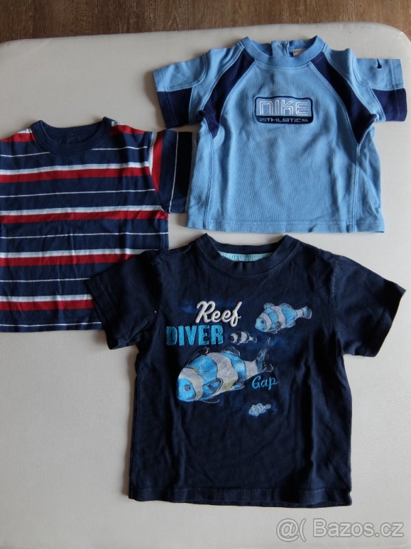 Prodám značková trička. Světle modré, zn. Nike. vel. 12 měs., délka 31 cm, šířka 29 cm. Cena 30.-Kč. Nové prouhaté, zn. Place, vel. 12 měs. délka 32 cm, šířka 31 cm. Cena 30.- Kč. Tmavě modré je již prodané.