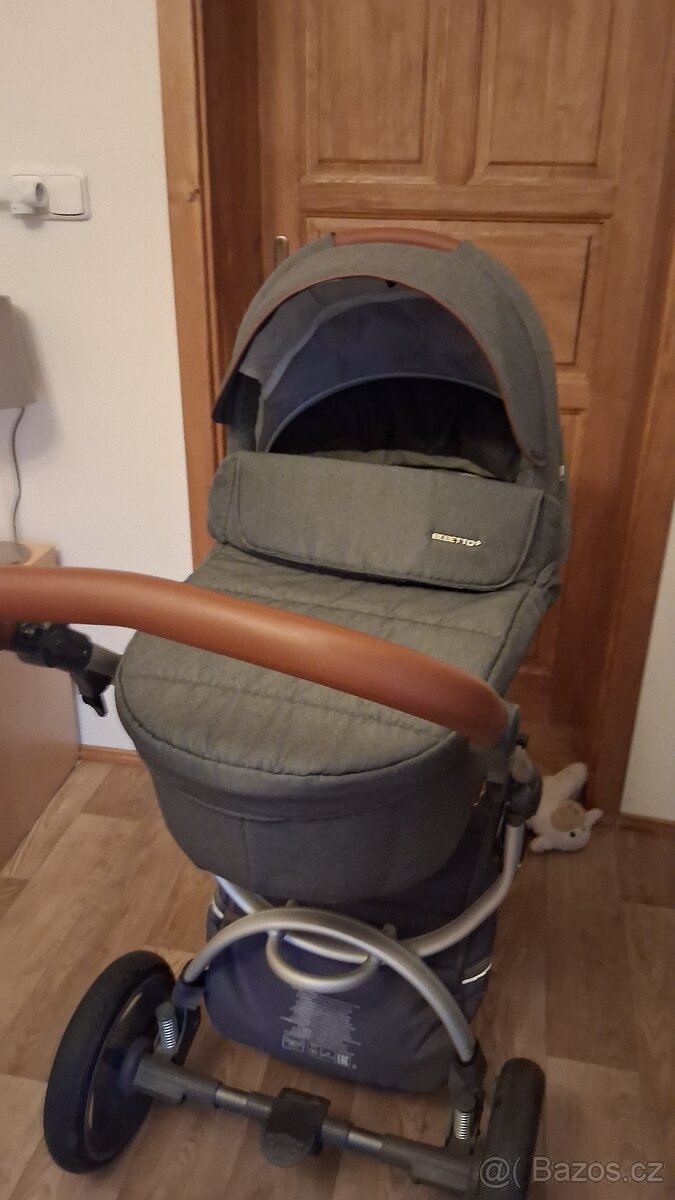 2 roky starý kočárek po jednom dítěti. Korbička pro miminko dostatečně dlouhá, mírně polohovatelná. Sporťák také polohovatelný. Stříška nastavitelná - roztažitelná.