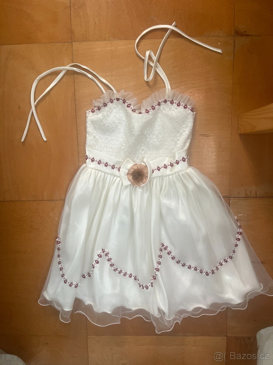 Bílé šaty jak pro družičku, 122–127 cm / 7 let, zavazování na ramenuo, polyester.