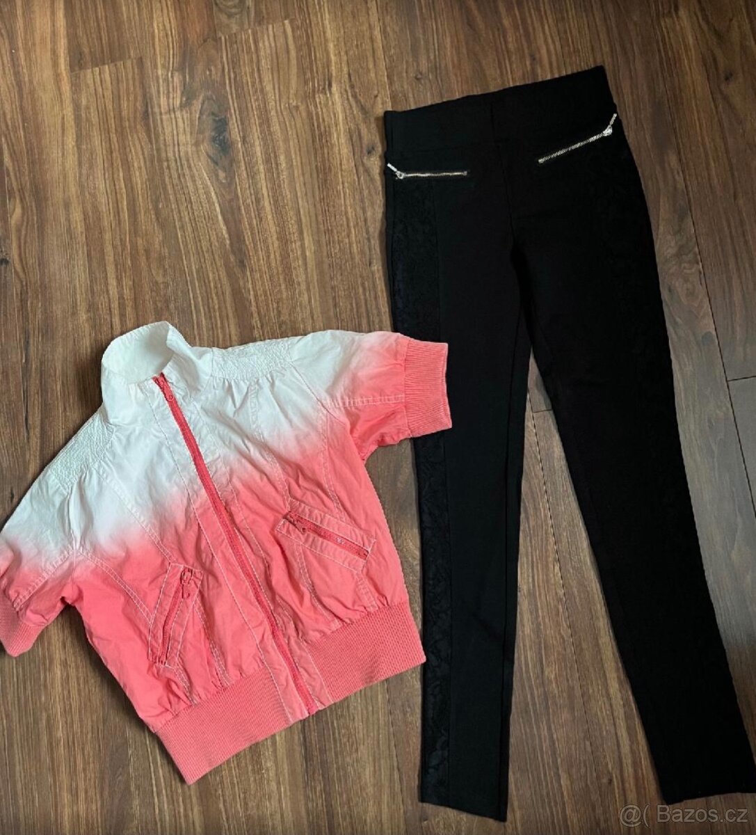 Dívčí oblečení vel. 146-152, leginy s krajkovým zdobením po celé délce nohavic s bokovymi zipy - jsou vhodné i do chladna, volnější vesta na zip a 2 mikiny - růžová je celá rozepínací na zip, druhá rozepínací u krku. Vše je ve velice pěkném stavu. Cena za vše. Mohu zaslat.