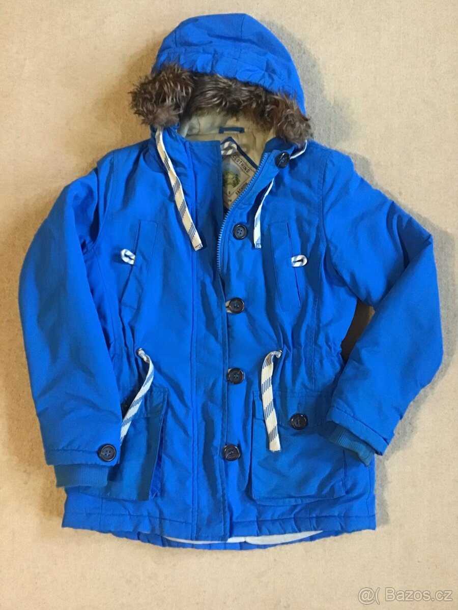 Dětská modrá bunda vel. 146-152, zapínání na zip s překrytím na knoflíky, velice slušivá, s kapuckou lemovanou kožíškem, délka bundy 72 cm (měřeno bez kapuce), šíře bundy přes hrudník 51 cm, délka rukávu od ramenního švu 60 cm. V pase možno stáhnout. Mohu zaslat.