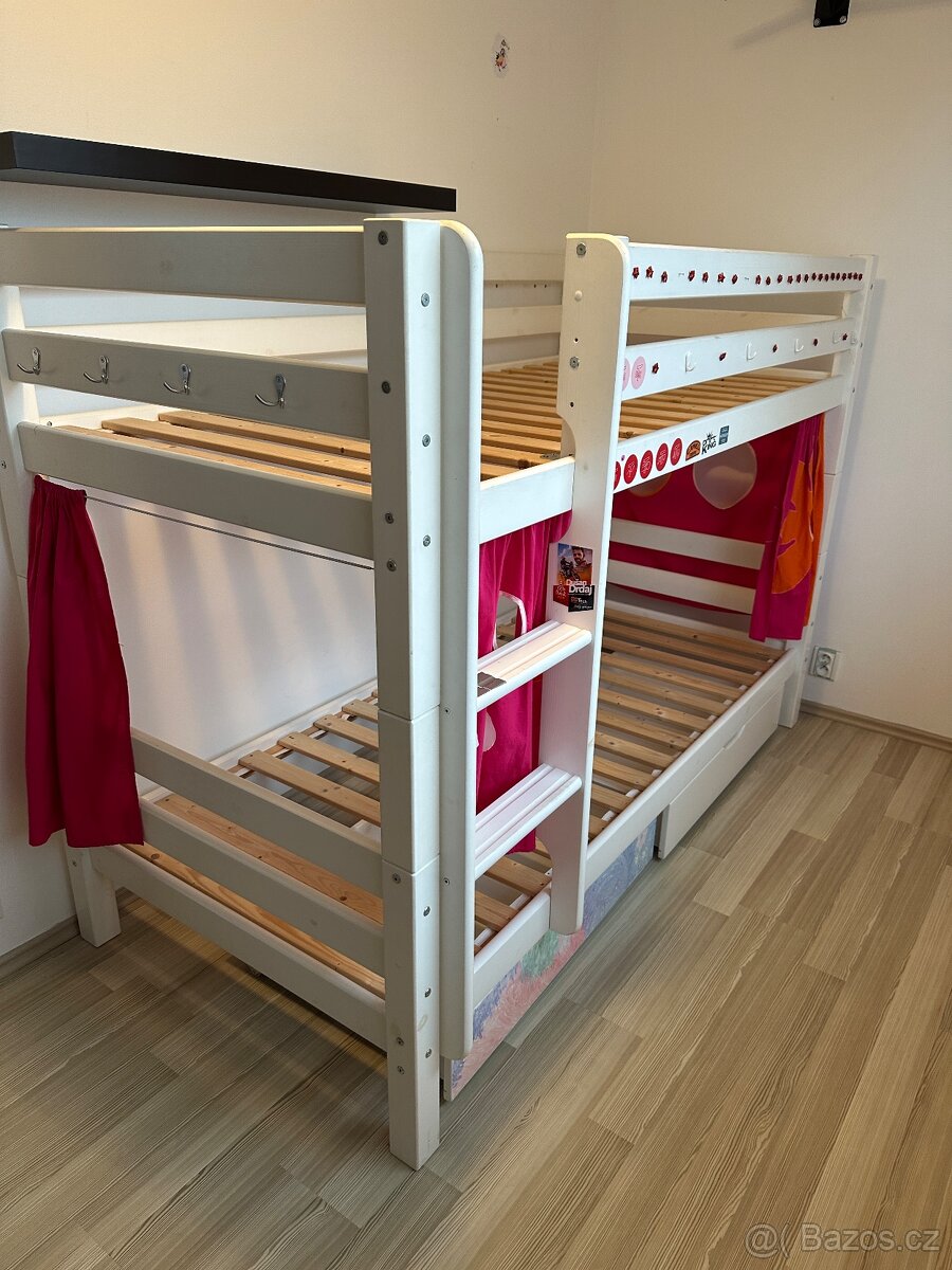 Prodám tuto kvalitní dřevěnou palandu z masivu, napadena dětmi viz foto (nálepky, háčky atd..), ale plně funkční a v pořádku. Součástí jsou dva pojízdné dřevěné šuplíky pod palandu. Přidám zdarma dvě matrace 90x200, jedna tloušťka 11cm stará cca dva roky, druha Purtex 20cm, stará 4 roky, fleky od děti, ale lze vyprat, kvalitní matrace. Cena za vše 1800kc.
