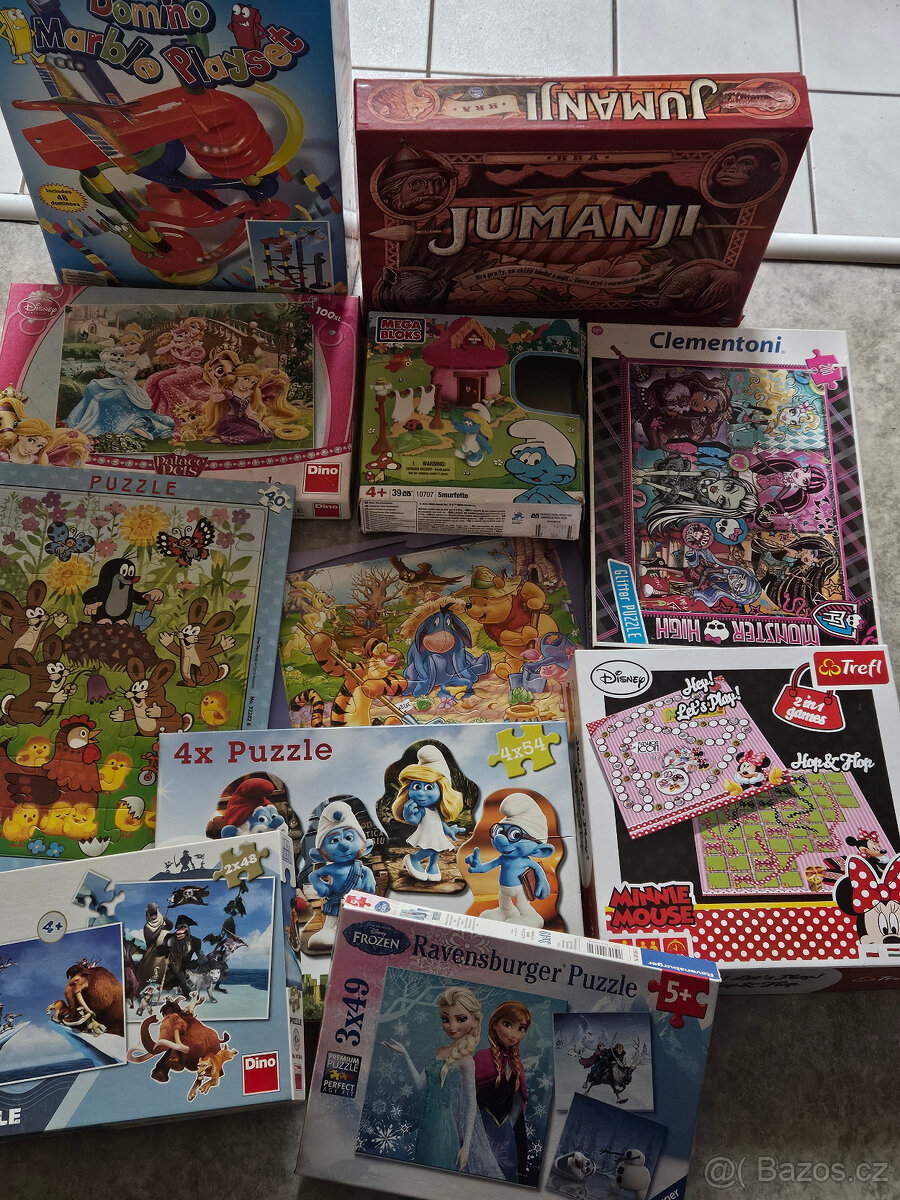Puzzle a hry, celkem za 1000 Kč, vše kompletní (kromě chybějící berušky a kytičky u Šmoulinčiného domečku a papírového letadla u kuličkové dráhy, ale to kompenzuji několika kuličkami navíc). Možno i jednotlivě, většinou kolem 100 Kč/ks. Osobní odběr v Brně.