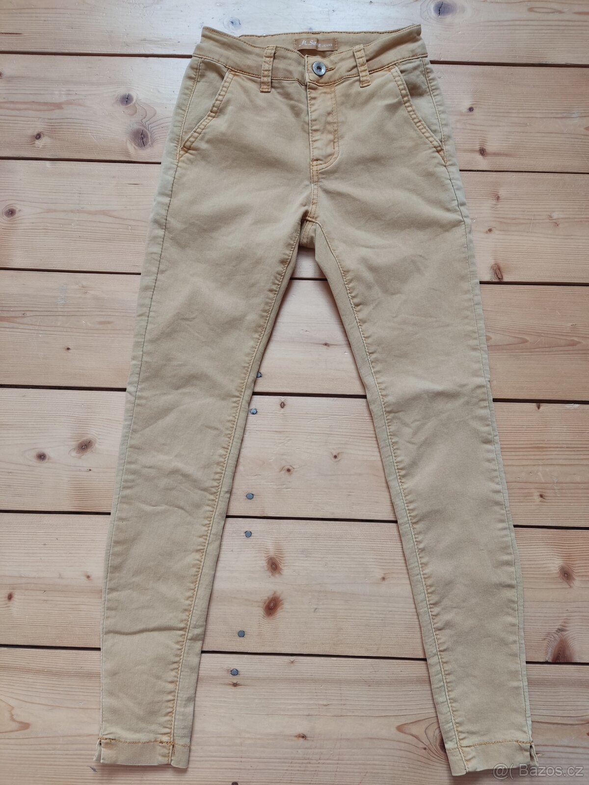 Dívčí kalhoty, velikost 26. Na švu v rozkroku mírne ošoupané viz. bližší fotka. Při nošení to nebylo videt, všimla jsem si toho až při focení.