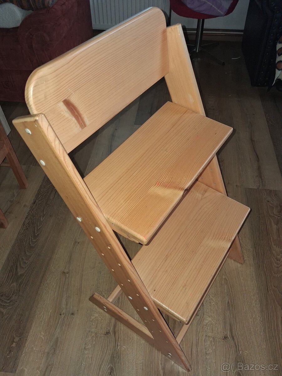 Prodám dřevěnou rostoucí židli pro děti. Má na sobě malé flíčky od růžové fixy, jinak v pořádku.
