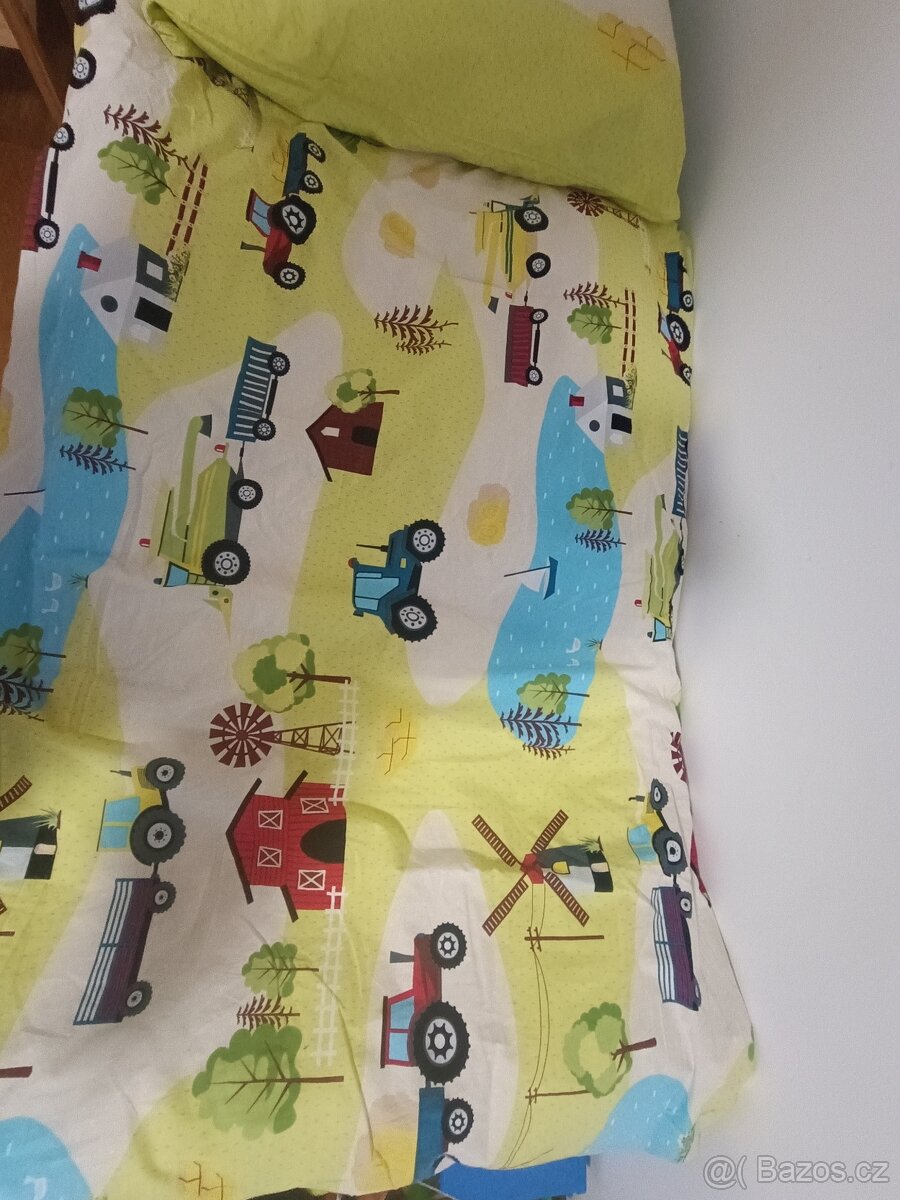 Dětské bavlněné povlečení z kolekce Matějovský se vzorem traktorů, stodol a jezírek na ekofarmě na světle zeleném podkladu. Ložní souprava je vyrobena ze 100% bavlny a obsahuje jeden povlak na přikrývku 140 x 200 cm a jeden povlak na polštář 70 x 90 cm. Zapínání na zip.