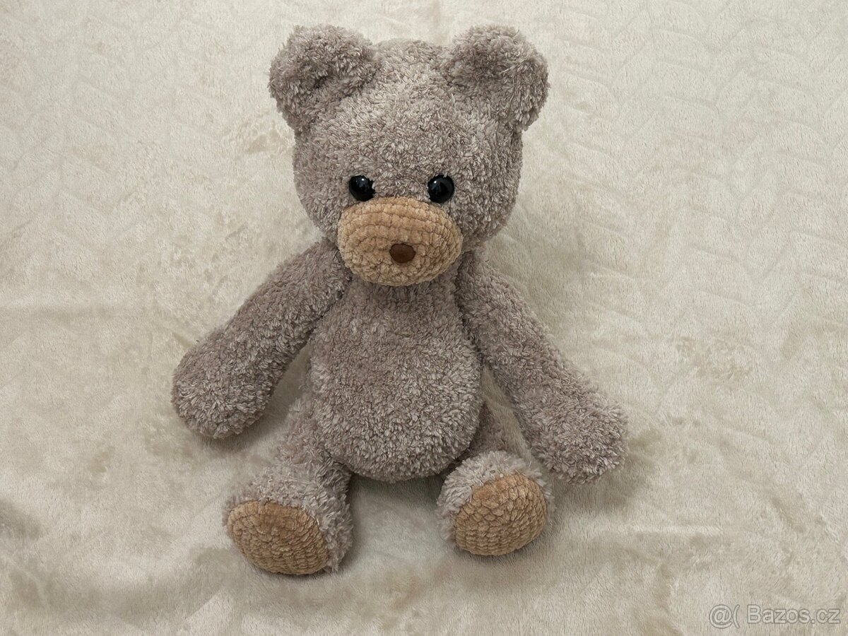 Zdravím, nabízím k prodeji hnědého ručně háčkovaného medvídka z příze foxy maccaroni. Medvídek umí sedět i ležet, je udělaný tak aby se mu hýbaly končetiny.