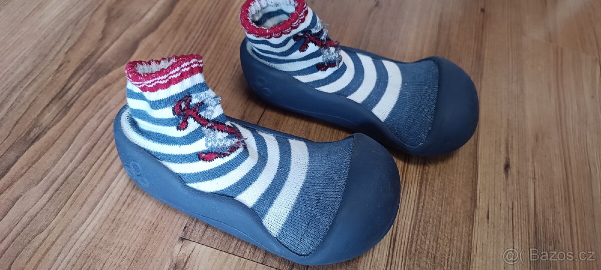 Snadné obutí, gumička dobře drží kolem kotníků. Lze použít na chození venku nebo i místo bačkůrek uvnitř. Neokopané, nesešlapané, velmi pěkný stav, chybí vnitřní vložka.