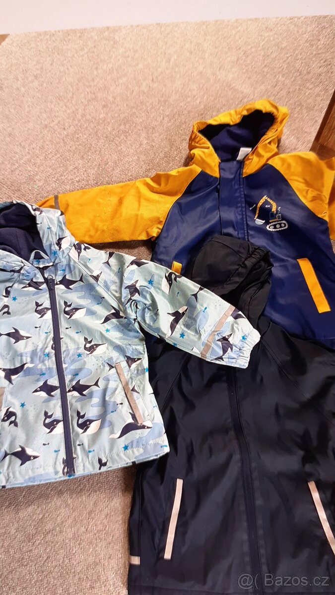 Prodam nepromokavou bundu v.98/104x2x,104/110x1x a nepromokave kalhoty v.86/82x1x,98/104x1x.Cena bundy a kalhot je 200kc.Samostatne kus 100kc.Zimni bundy 80x1x,98/104x2x (1kus 1500kc),zimni kalhoty v.92x1x,98/104x1x (1kus 100kc).Manzestraky v.98x1x (200kc).