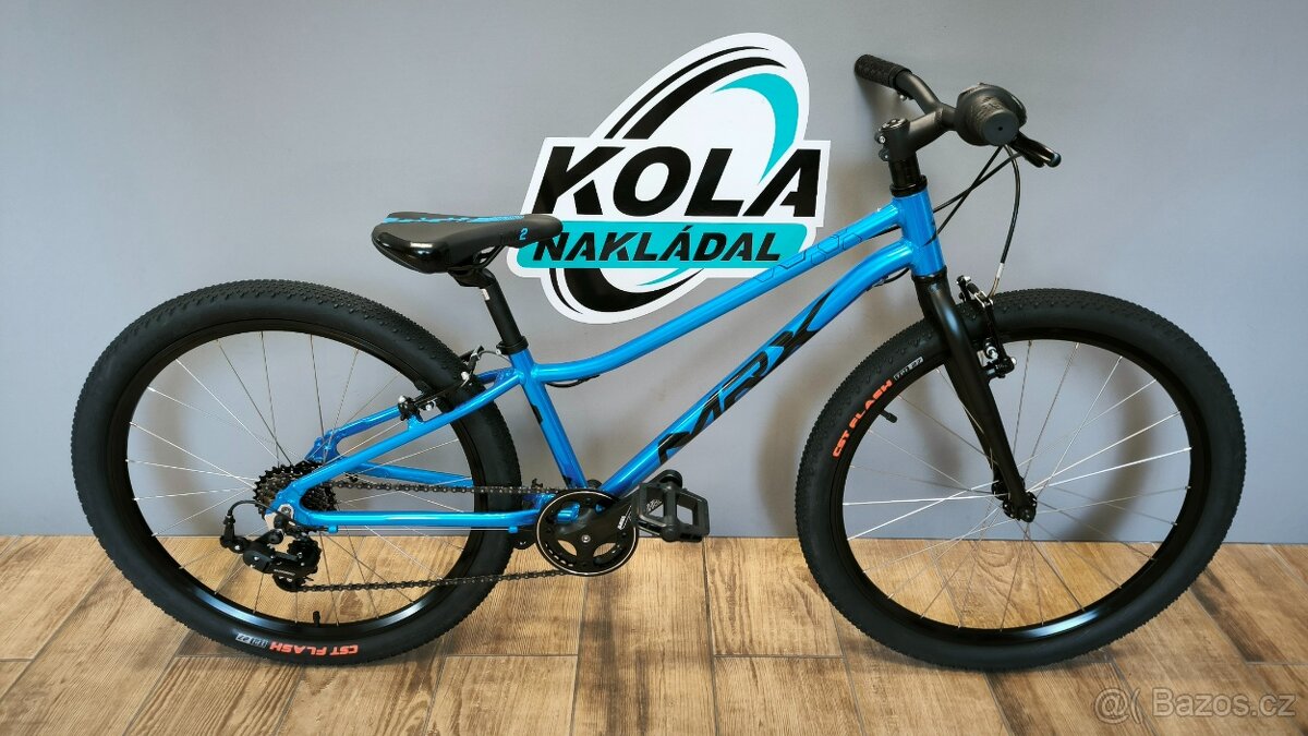 Dětské kolo české značky MRX, kola průměr 24" rám Al. velikosti 11" (280mm) pevná vidlice Al. výbava Shimano převody 1x7 28x14-28z váha 9,5kg. Pro děti velikosti cca 120 - 135cm. Novinka značky MRX pro rok 2025, ložiskové náboje pro hladký chod, integrované vedení (bowdeny řazení/brzd) pro čistý vzhled, tři barevné provedení, atraktivní design, nízká váha a cena. Doporučená cena 8.700,- sleva -20% cena 6.990,-