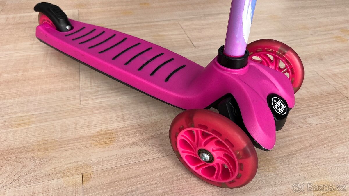 Prodám dětskou koloběžku se svítícími kolečky. Trojkolka je značky Playtive původně kupovaná za 649,-kč z Lidlu. Kvalitní měkká kolečka s ložisky ABEC 5.