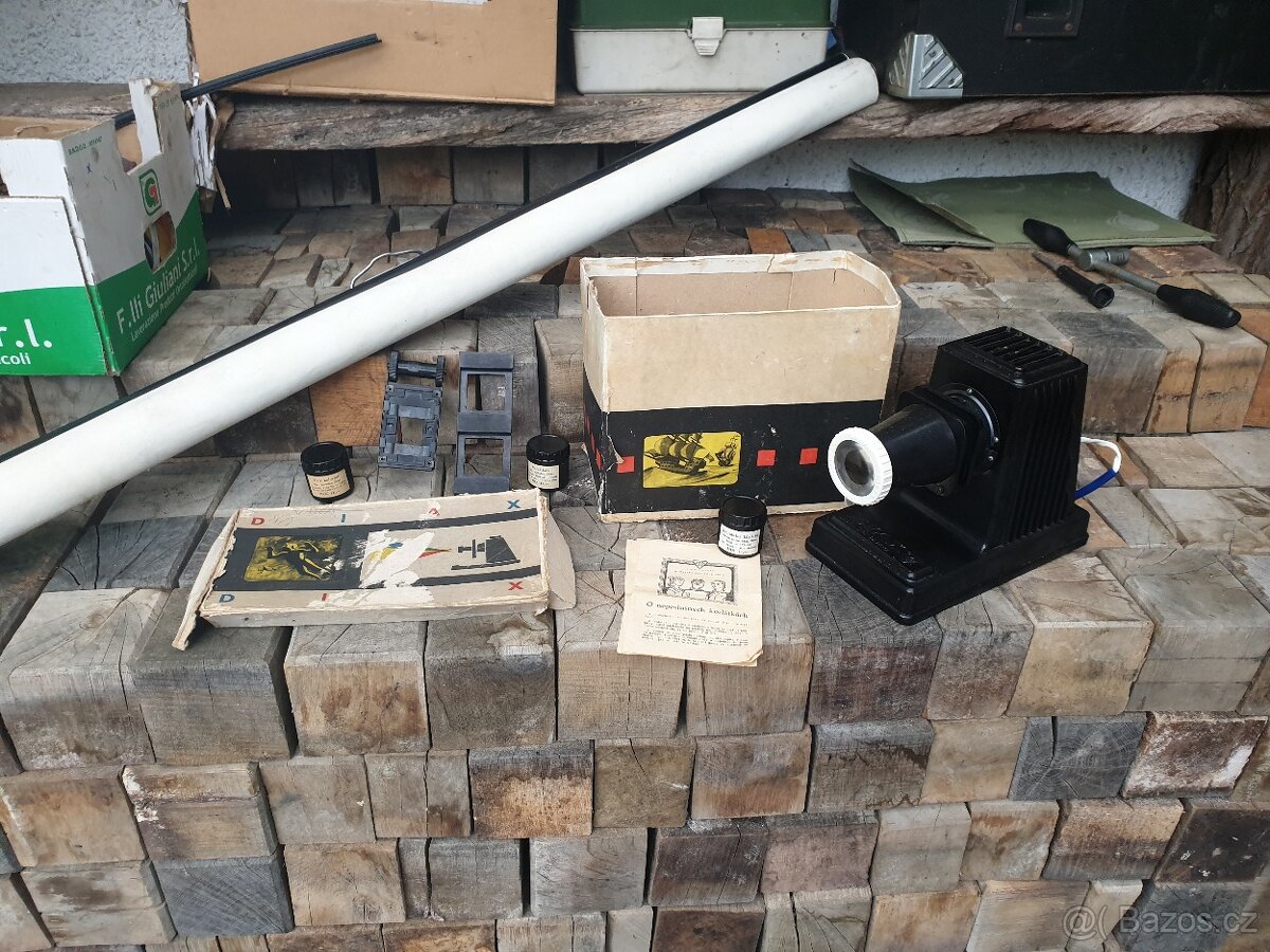 Krásný starý projektor s projekčním plátnem v perfektním stavu.